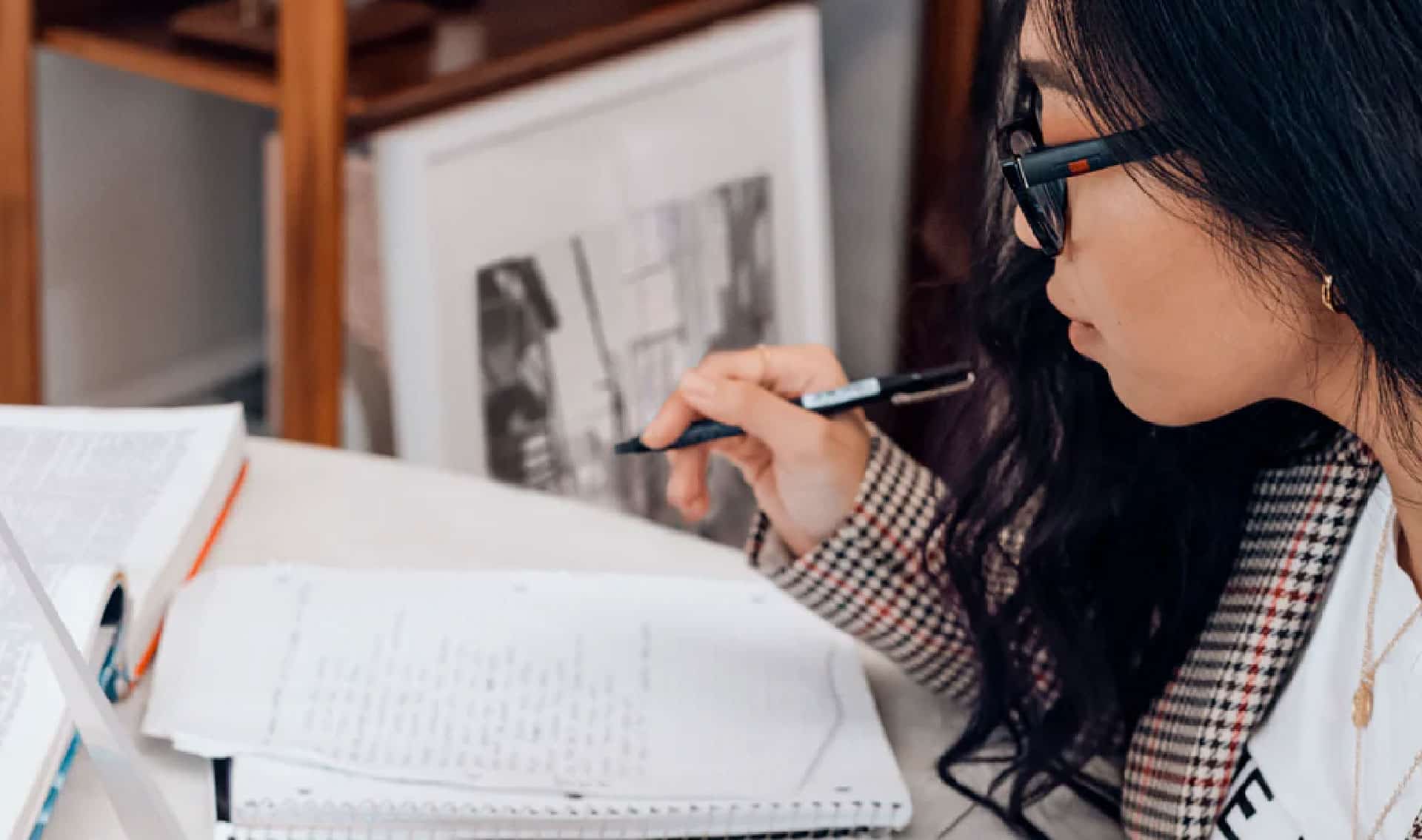 Photo of a student sitting at a desk using their laptop with a pen and notepad on the desk.